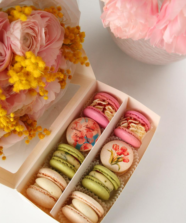 - Подарочные наборы: с возможностью нанести на макарон любую иллюстрацию (для частных поздравлений или корпоративных логотипов).