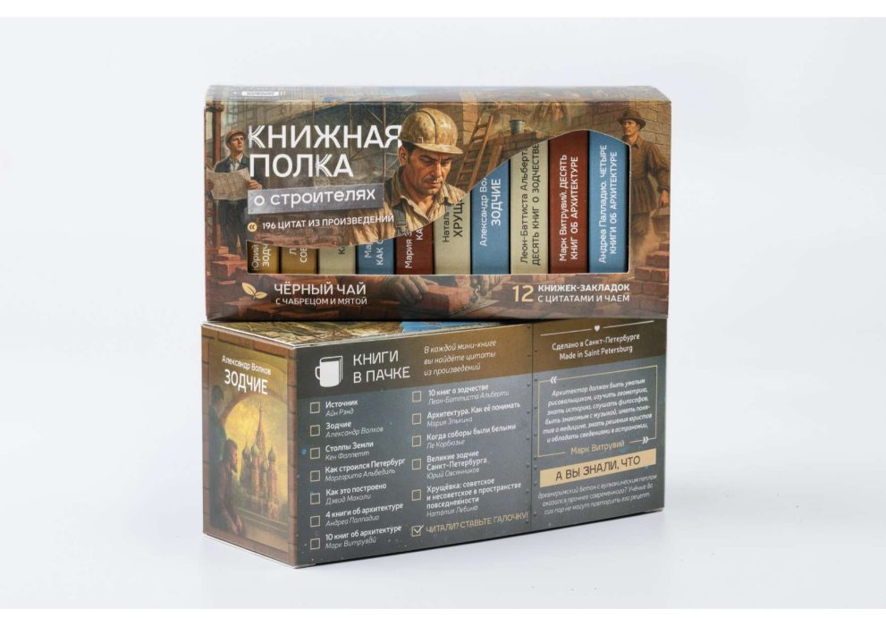 Книжная полка. Чай со смыслом — это тематические наборы из 12 мини книг с цитатами авторов произведений и качественный чай, который мы фасуем сами в чайные пакетики. Пакетик с чаем вложен внутрь каждой мини книги.