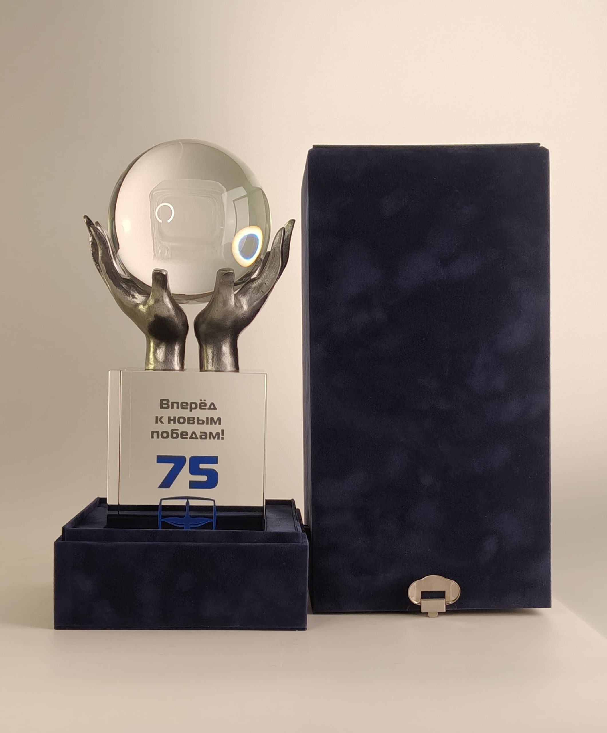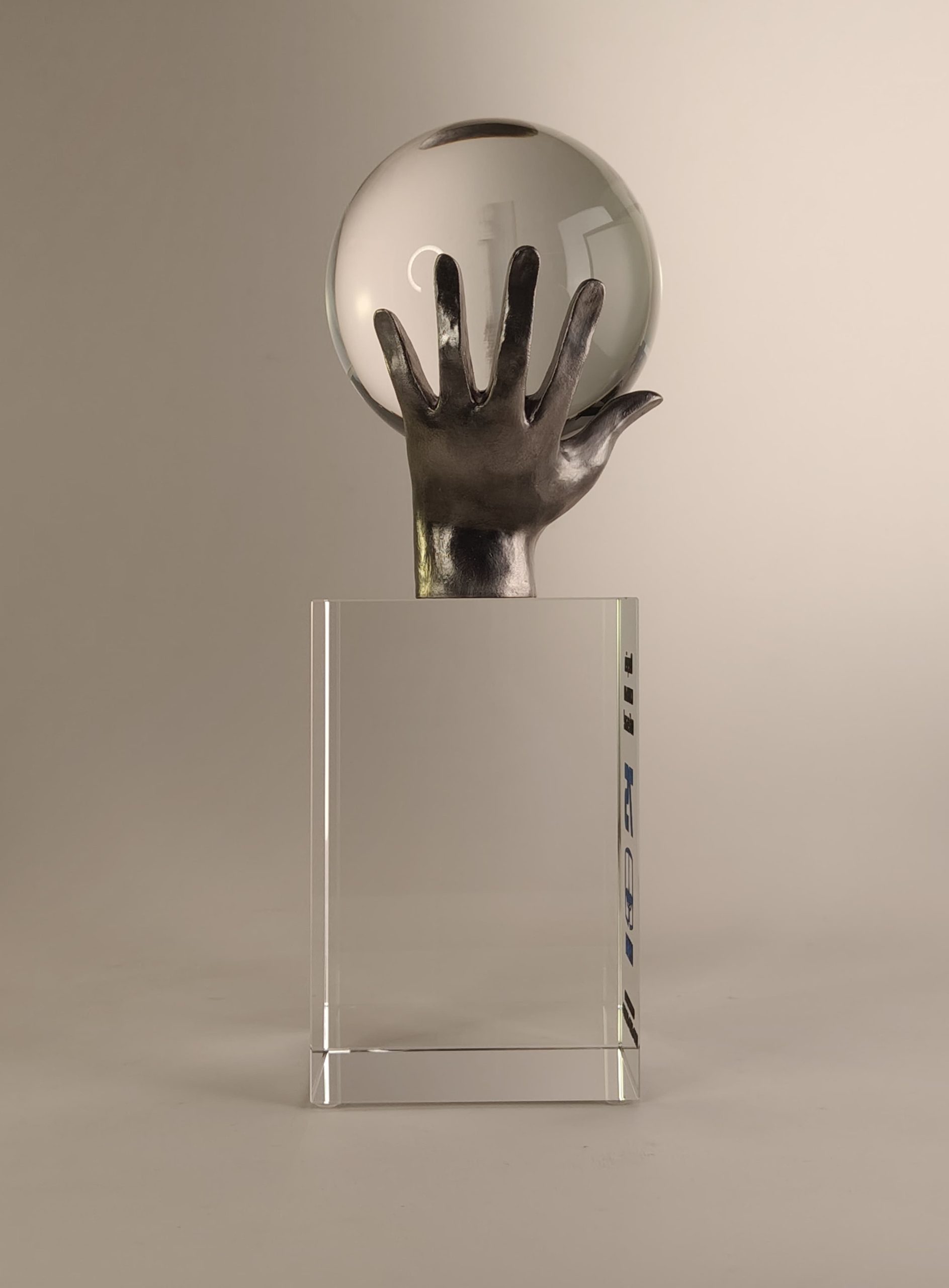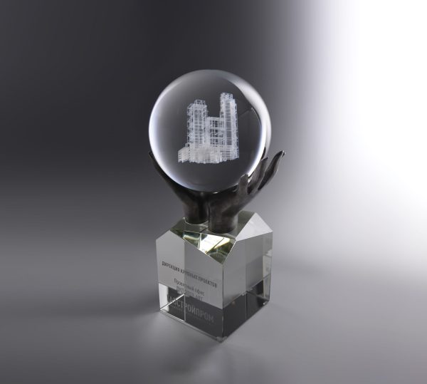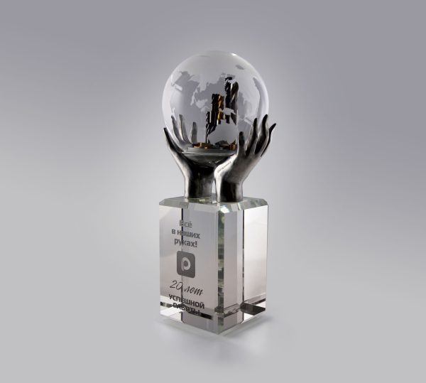 Ладони из металла, как символ заботы, надежно держат шар (Ø110) из оптического стекла. Мы можем предложить широкий выбор методов персонализации: 2D или 3D гравировку внутри стеклянных элементов.