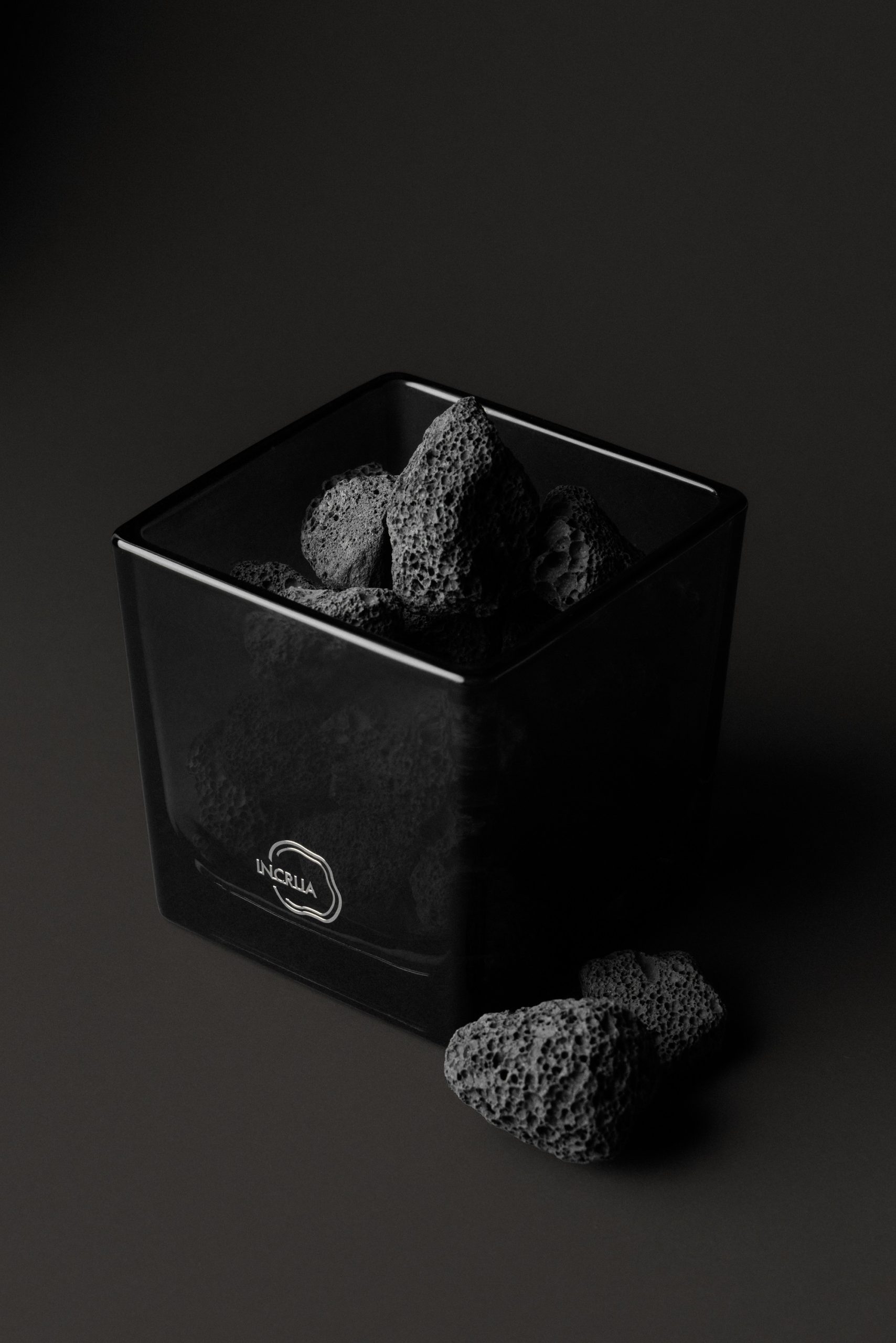 Диффузор с вулканическими камнями и аромамаслом (5 мл) в стакане из темного стекла.
