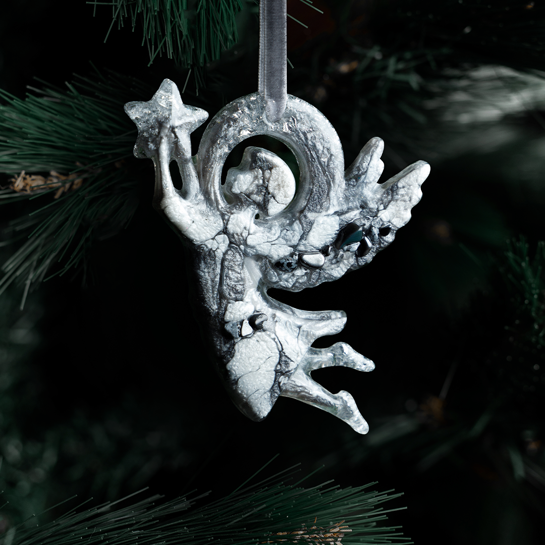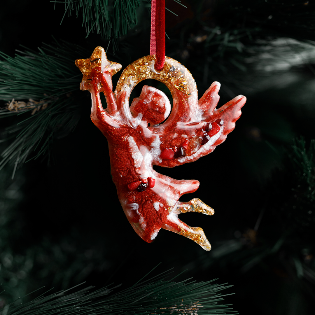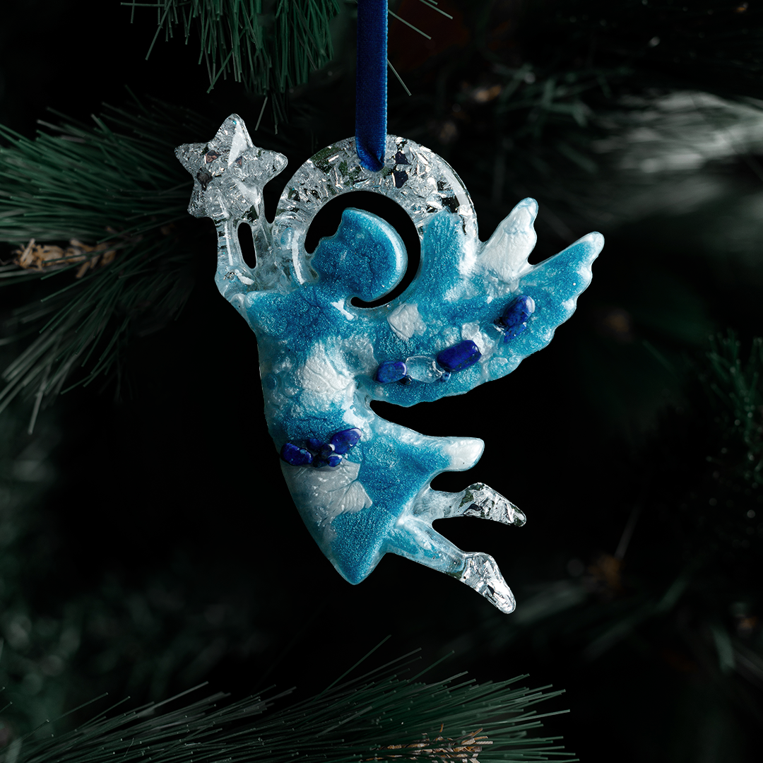 Ёлочная игрушка Ангел из коллекции Рождество — это небесный вестник, который принесет в дом мир, любовь и благополучие. Выполнена из ювелирной эпоксидной смолы и украшена галтовкой из натуральных минералов. Доступна в трех цветах: Гранат, Сапфир и Горный хрусталь.