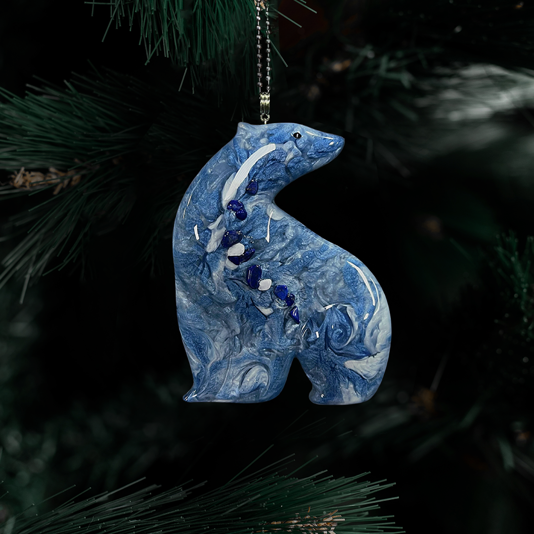 Игрушка изготовлена из ювелирной смолы с аккуратной ручной отделкой и тщательно подобранными натуральными камнями. Глубокий «Королевский синий» придаёт праздничному декору особую царственную элегантность и выразительность.