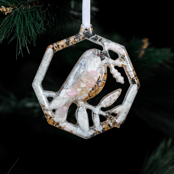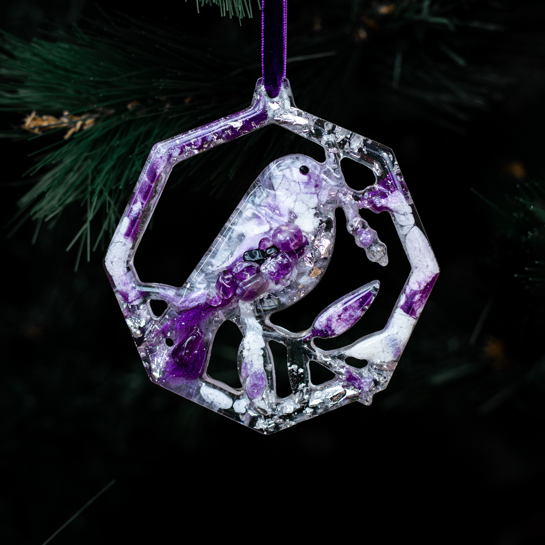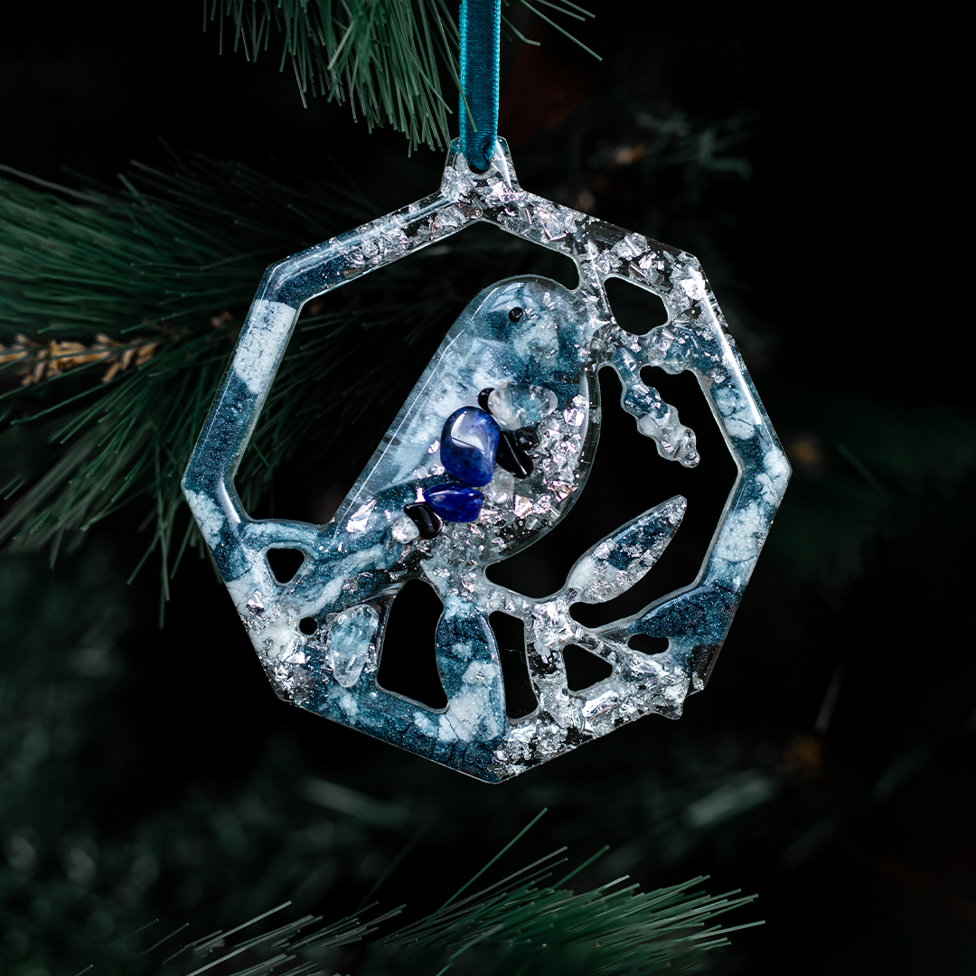 Ёлочная игрушка Снегирь из коллекции STORIES — очаровательная птичка, символ русской зимы и Рождества. Выполнена из ювелирной эпоксидной смолы и украшена галтовкой из натуральных минералов. Доступна в четырех цветах: Аметист, Розовый кварц, Сапфир и Горный хрусталь.
