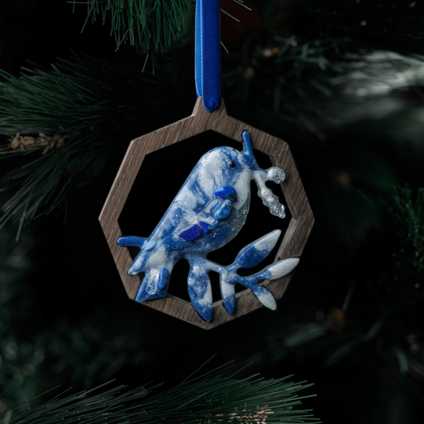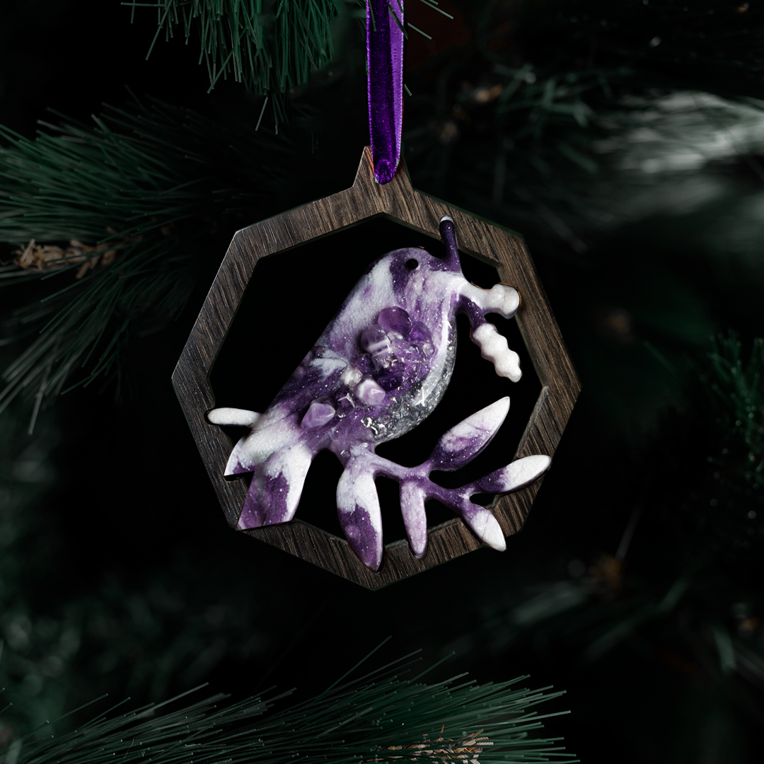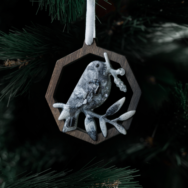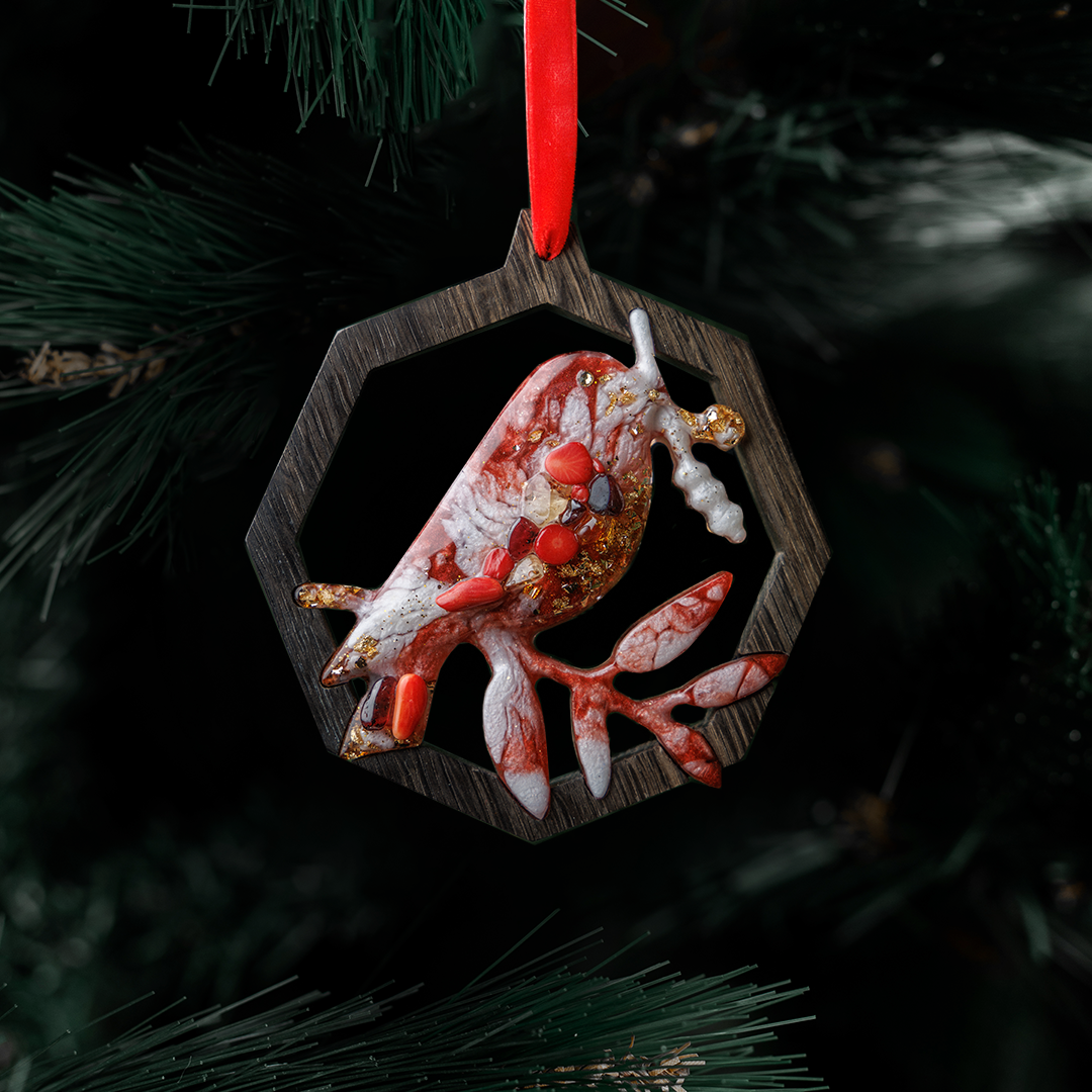 Елочная игрушка в форме снегиря. Выполнена из ювелирной эпоксидной смолы и мореного дуба, украшена галтовкой из натуральных минералов.