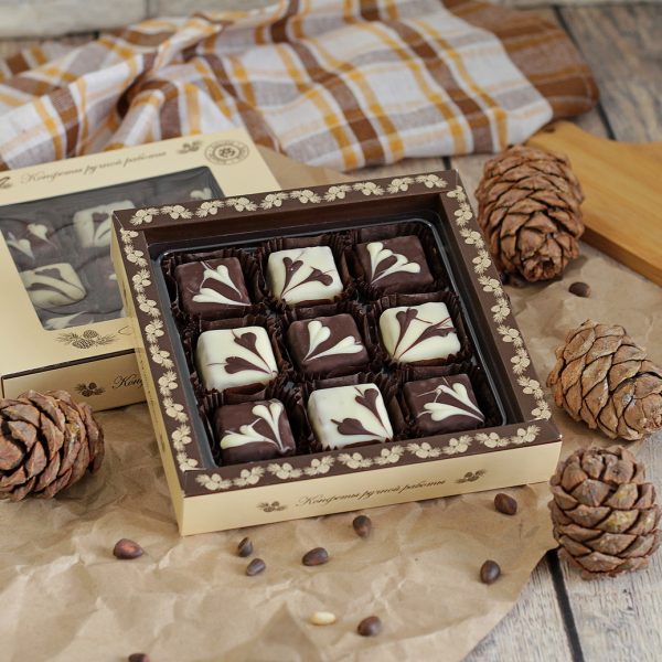 Ядро кедрового ореха, мед, халва кедрового ореха, патока крахмальная карамельная, клюква. Шоколад: какао-тертое, сахар, какао-масло, эмульгатор (Е322- подсолнечный лецитин), натуральный экстракт ванилина. Белый шоколад: сахар, какао-масло, сухое молоко, натуральный экстракт ванили.