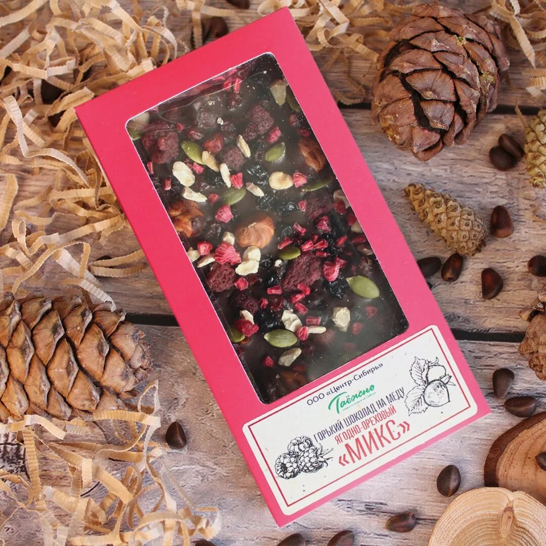 Шоколад горький на меду ягодно-ореховый микс 100 г "Таежно"