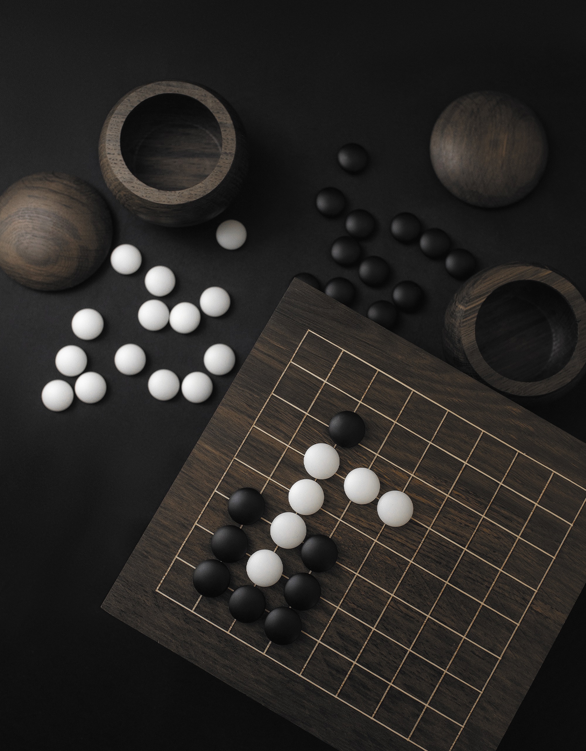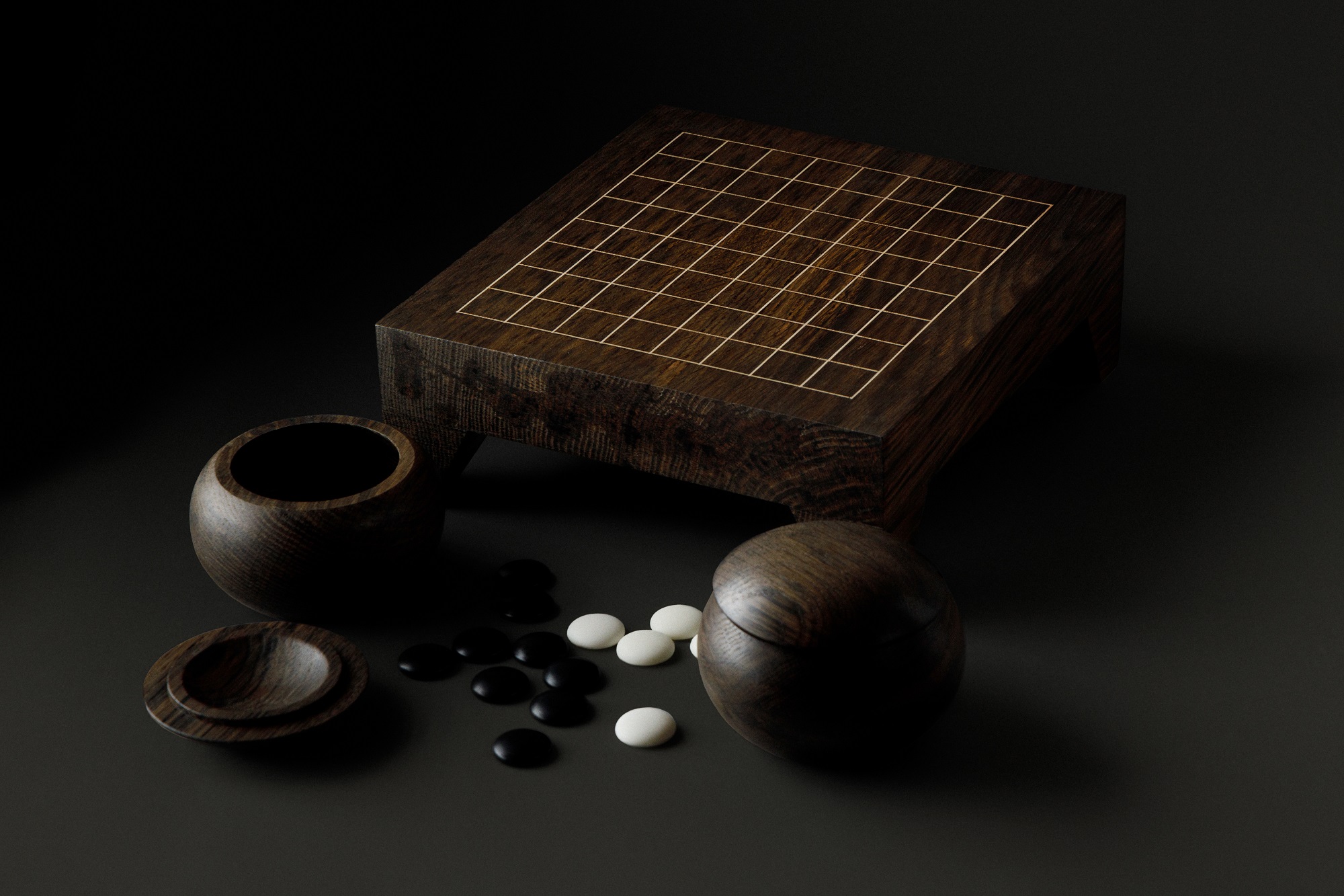 Набор для игры в Го, включающий в себя доску для игры, 40 фаянсовых фишек и 2 чаши для их хранения. Доска и чаши выполнены из мореного дуба. Поле для игры на доске создано с применением вставок из латуни.
