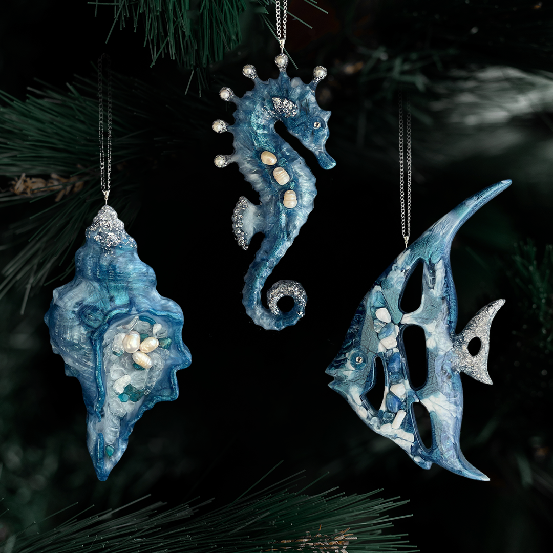 Набор ёлочных игрушек «Тайны океана» приглашает окунуться в мир подводных чудес, где каждая игрушка отражает красоту морской стихии. В коллекцию вошли «Морской конёк», «Ракушка желаний» и «Жемчужная рыбка» — символы таинственного и прекрасного подводного мира. Эти игрушки выполнены из ювелирной смолы и инкрустированы природными минералами.