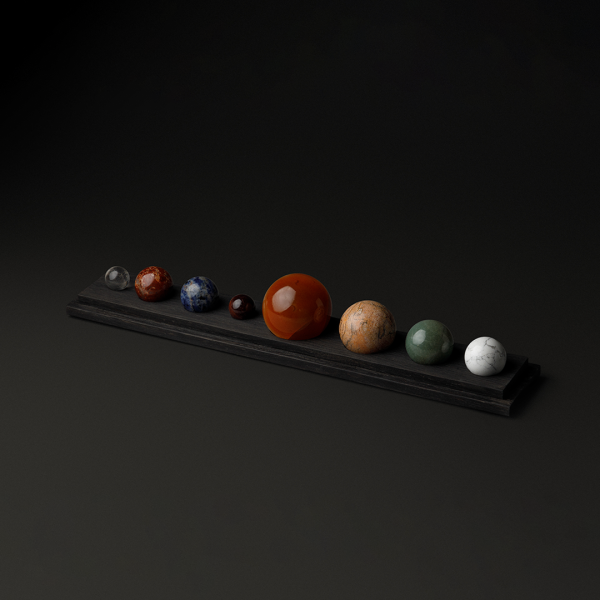Интерьерное украшение для стола состоящее из подставки из мореного дуба и восьми шаров из натуральных минералов большого размера