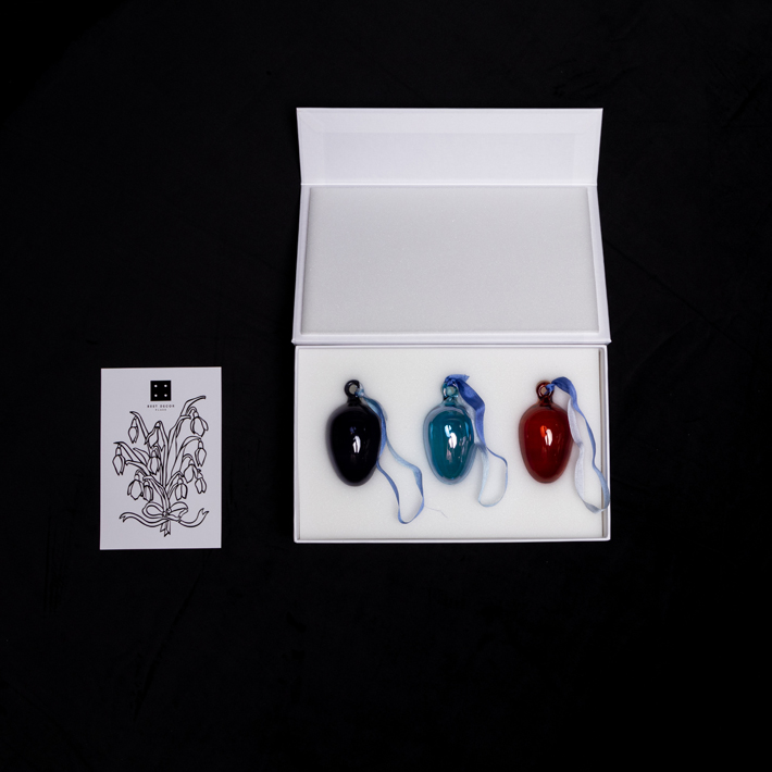 Набор из трех стеклянных подвесов ручной работы в форме яиц — выражение глубоких смыслов и дань традициям светлого праздника Пасхи.Темная палитра декоративных украшений отражает оттенки, наполняющие природу с приходом весны.
