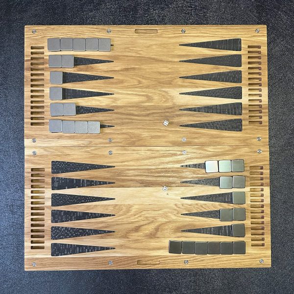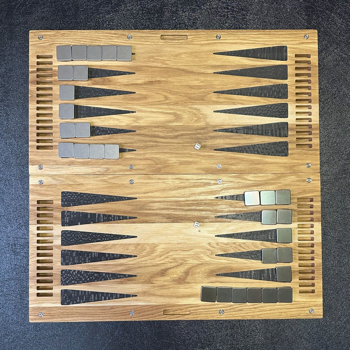 Нарды ручной работы из благородного дуба с инкрустацией экзотическими породами деревьев и шашек квадратной формы из специально обработанной нержавеющей стали.