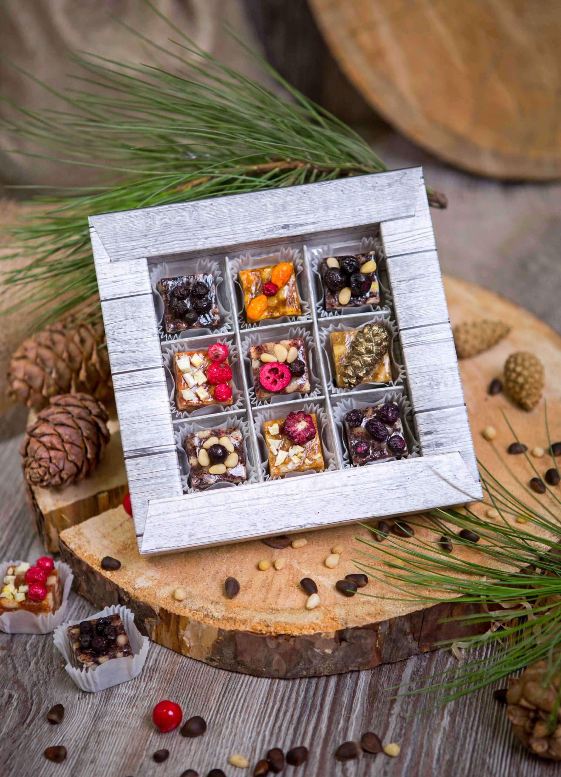 Ядро кедрового ореха, мёд, халва из кедрового ореха, патока крахмальная карамельная. Ягоды: голубика, калина, клюква, брусника, облепиха, черноплодная рябина, черника, черная смородина, шишка сосновая.