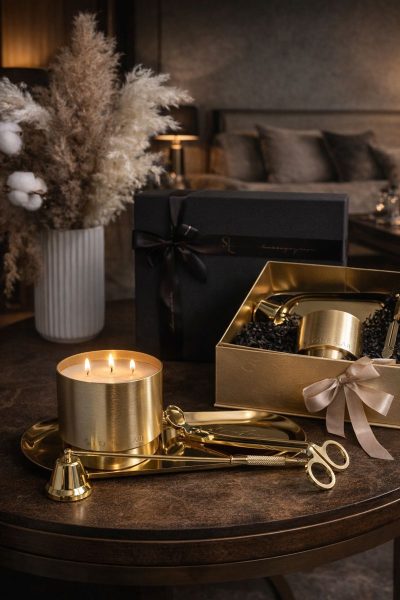 Профессиональные аксессуары (гаситель пламени, триммер для фитиля, ножницы для фитиля, подставка-поднос) позволяют ухаживать за свечой, продлевая её срок службы и сохраняя идеальный внешний вид.