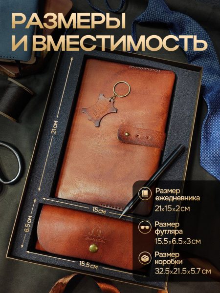 Коньячный ежедневник из натуральной кожи с уникальным дизайном и ручной обработкой швов. Подарочная упаковка. Качественный продукт для ценителей премиальных вещей. В комплекте стильный футляр для очков, внутренний размер 14*6см, подарочная лента, фирменный брелок, ручка.