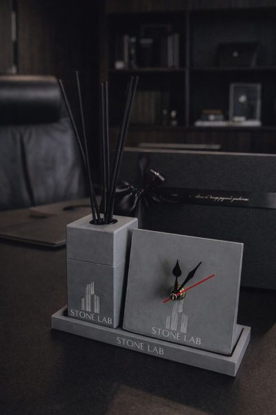 Подарочный набор, объединяющий настольные часы и ароматический диффузор в гипсовом кейсе на подставке — элегантное решение для современного интерьера.