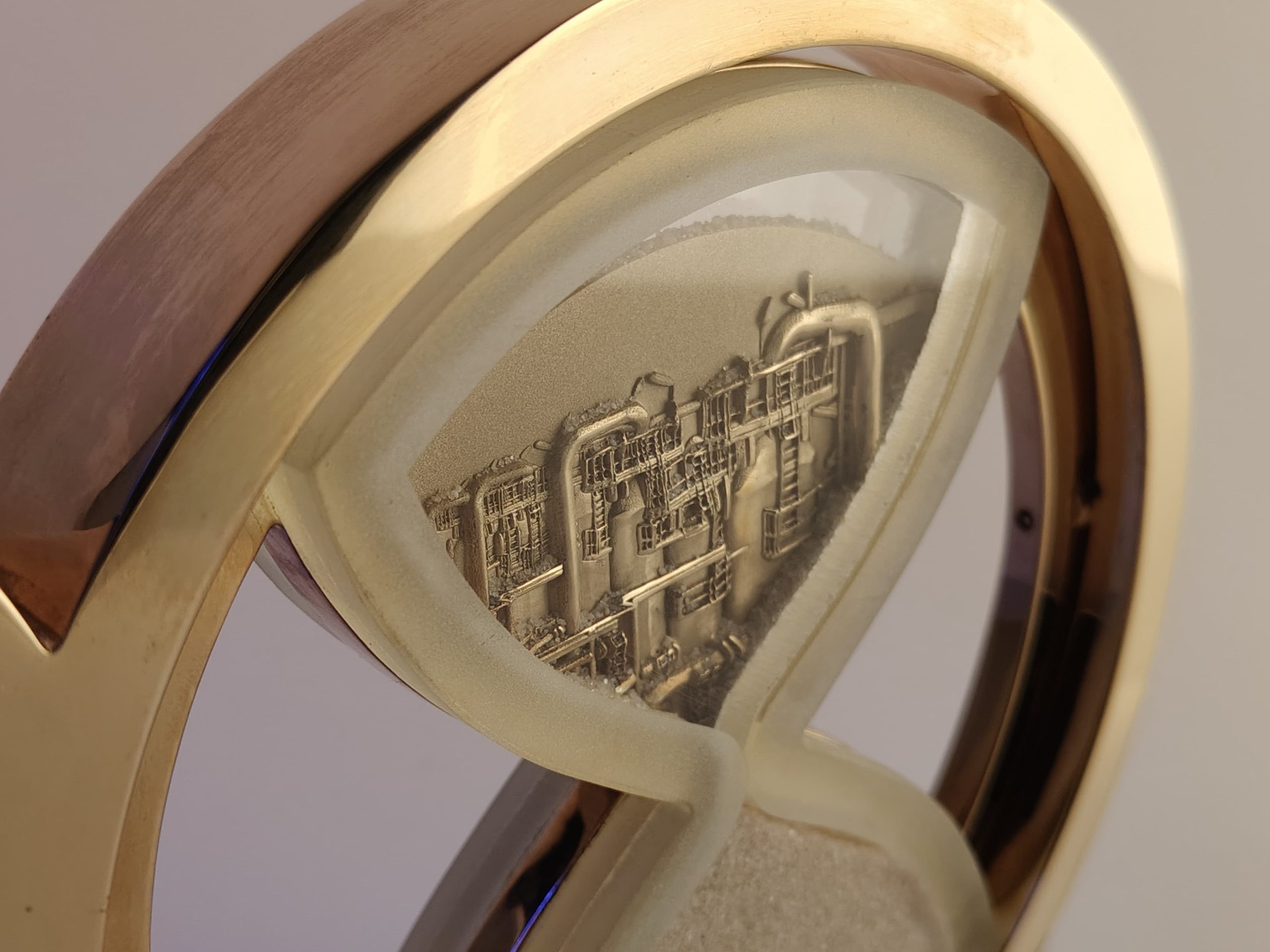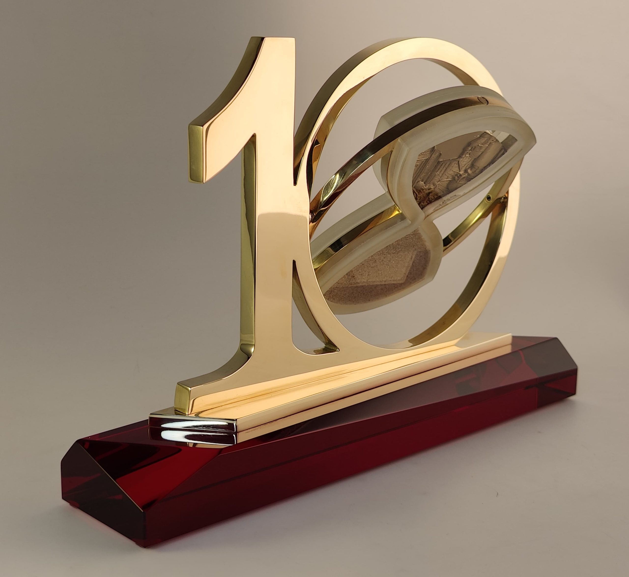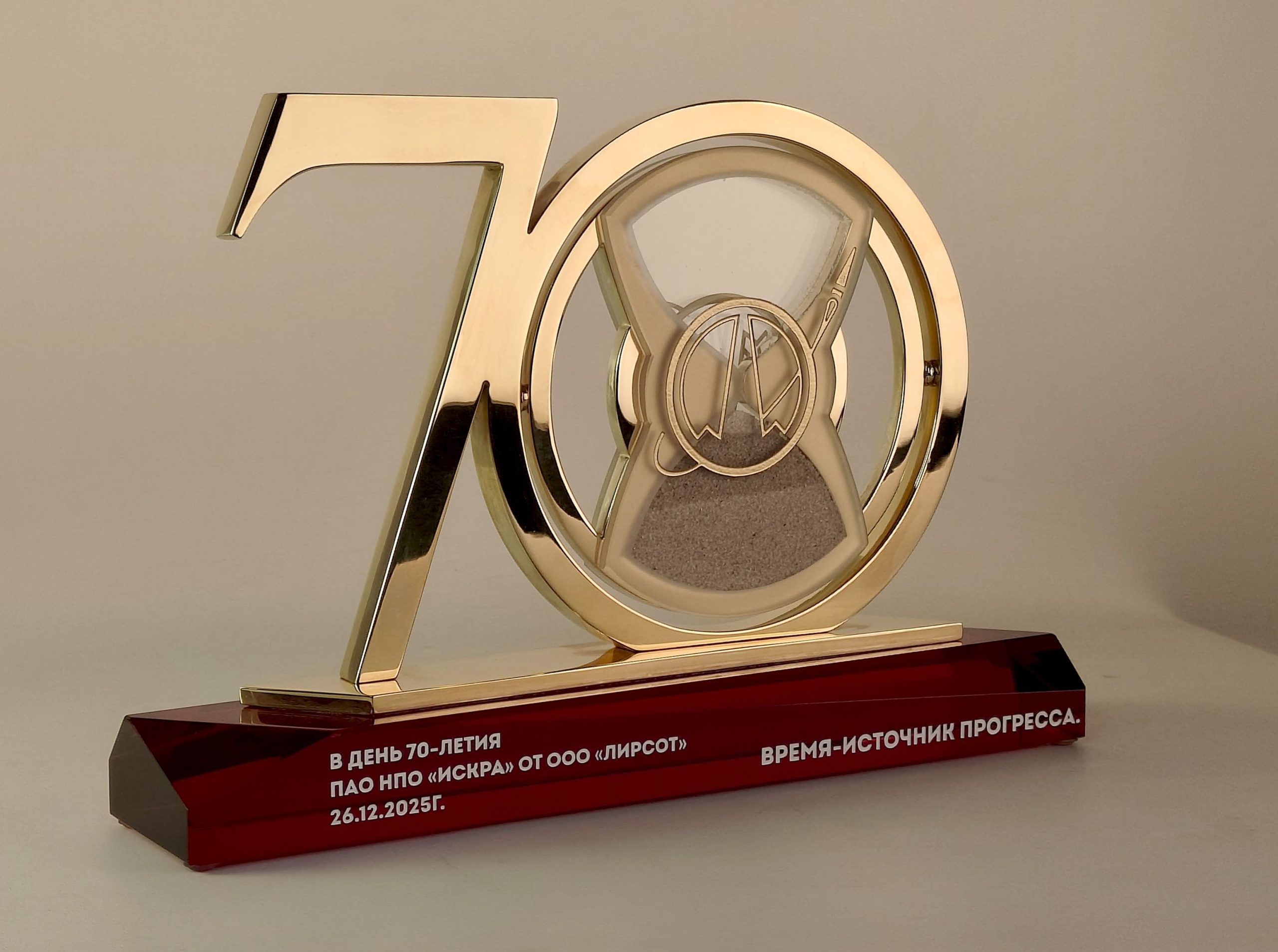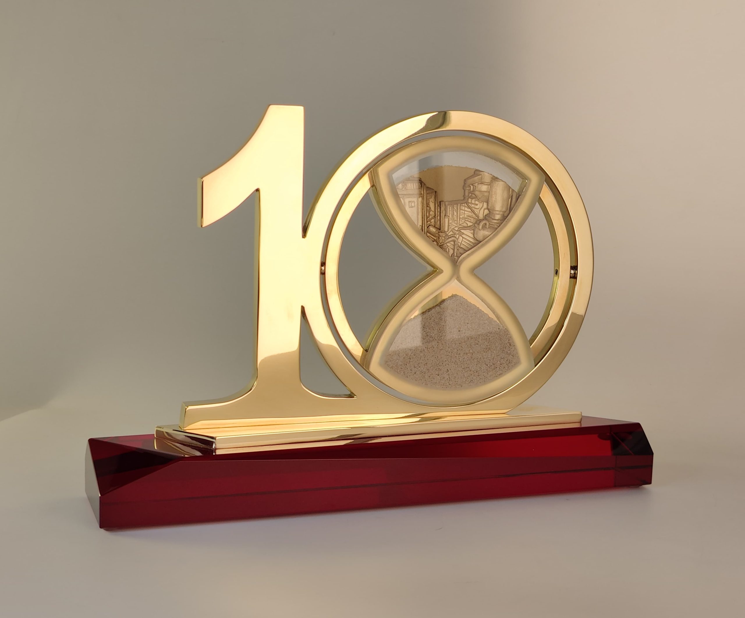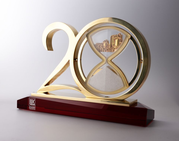 Металлические цифры юбилея надежно закреплены на стеклянном постаменте. Внутри одной из цифр вращающиеся песочные часы. Песок постепенно перетекая из одной колбы в другую открывая силуэт, который мы выполним по Вашему желанию.