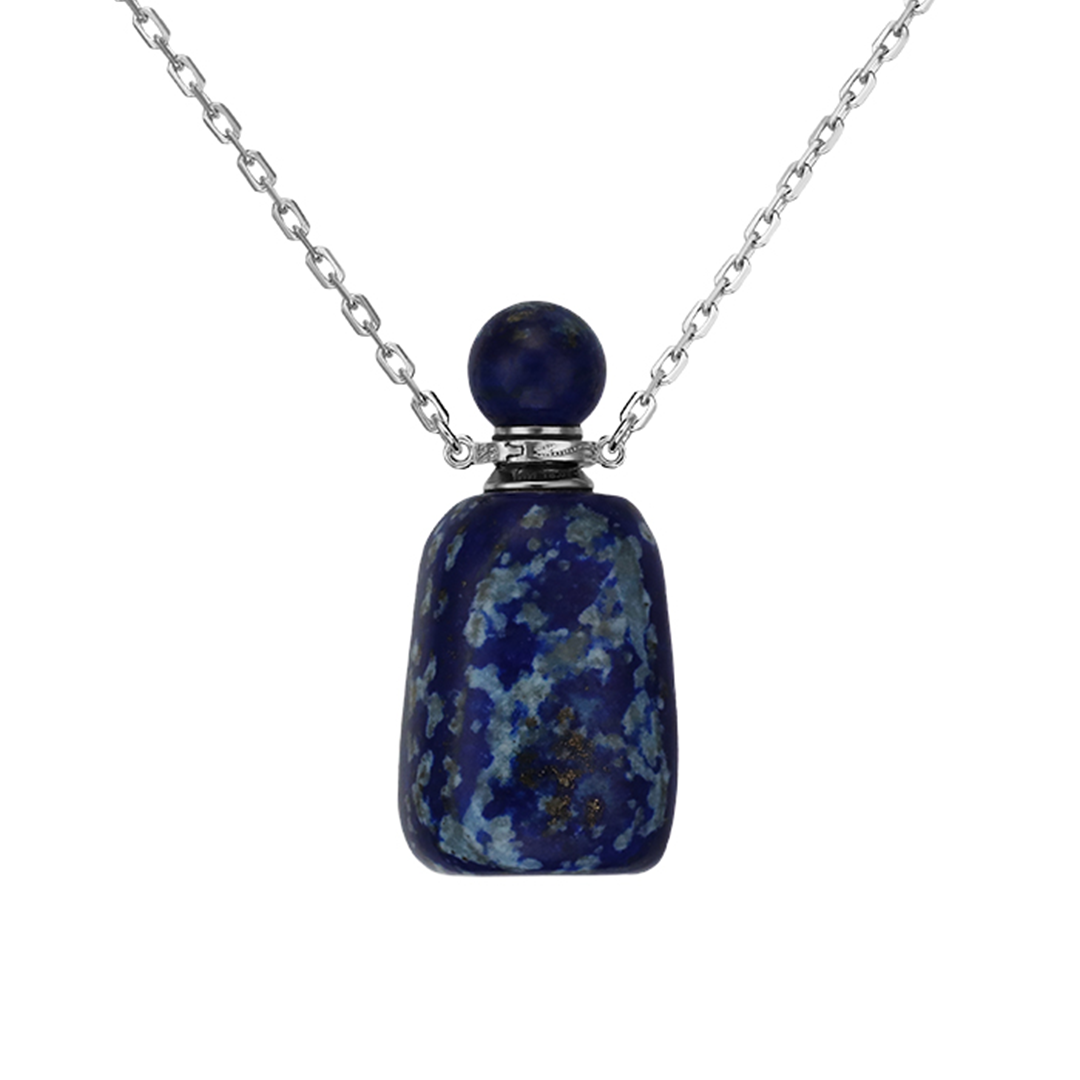 В центре внимания — изысканный кулон-флакон, выполненный из натурального лазурита насыщенного синего цвета. Это не просто украшение, а ваш личный талисман, который позволяет всегда иметь под рукой любимый парфюм или терапевтическое эфирное масло.