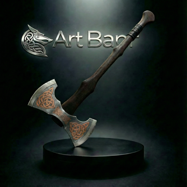 Секира кованая Art Варг с гравировкой и меднением узора. Кованая секира гравировкой и золотым рисунком. И для работы, и для интерьера. Есть варианты с подставкой. Идёт с чехлом. Максимальное брендирование: возможна гравировка бренда на стали, на кожаном чехле, на деревянной рукоятке, на деревянной подставке, на упаковке (кожаный мешок, деревянная коробка, тканевый мешок). Возможен покрас секиры в брендовый цвет. Изготовление рукояти из более ценных пород дерева (без ограничений).